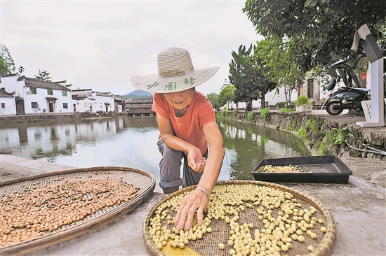 8月1日,村民在诸葛村的一处水池边晾晒莲子。