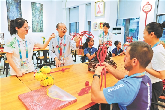 成都大运村里设置了包括皮影、剪纸、刺绣、草编等非遗项目在内的中国文化体验项目,吸引众多代表团成员前来参与。在这里,各代表团成员可以更加切近地感受、了解中国非遗文化的魅力。