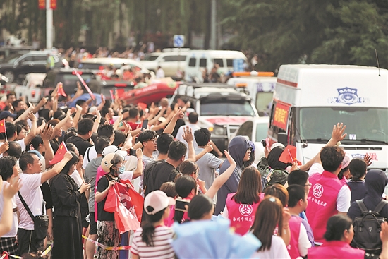 今天,许多涿州市民自发来到这里。他们拉着横幅,挥着国旗,用一声声“感谢”和“再见”,送别来自天南海北的“亲人”。