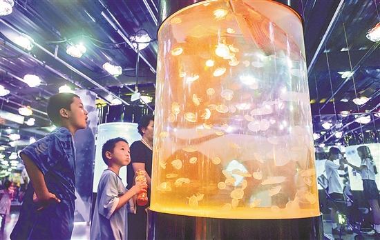 8月6日,家长带着孩子在河南洛阳龙门海洋馆参观。