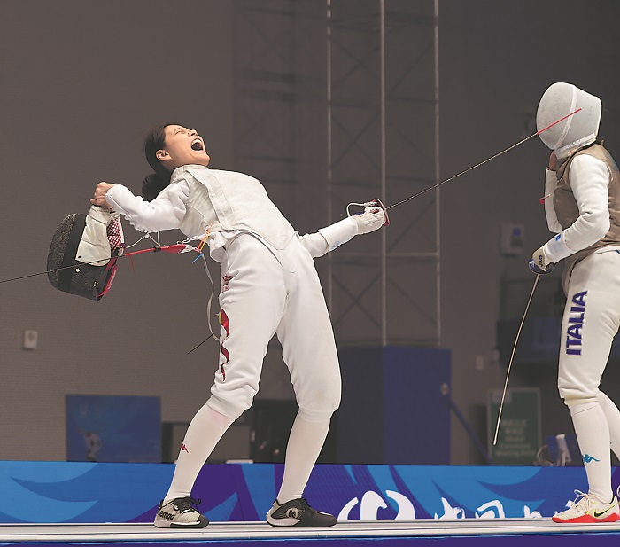 8月6日下午,在成都大运会女子花剑团体决赛中,中国队以45比22战胜意大利队获得冠军。图为中国选手黄芊芊在庆祝胜利。