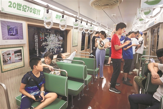 8月8日,北京地铁“时光列车”在1号线八通线上线试运营。“时光列车”让乘客在乘车过程中感受时代变迁,共同回顾和见证首都城市发展的时代记忆。本报记者 王伟伟 摄