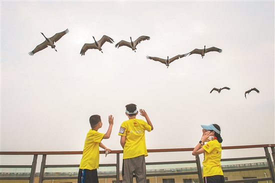 8月5日,在山东黄河三角洲国家级自然保护区,“小麦苗成长夏令营”的孩子们观看国家二级保护动物蓑羽鹤,感受生物多样性的魅力。