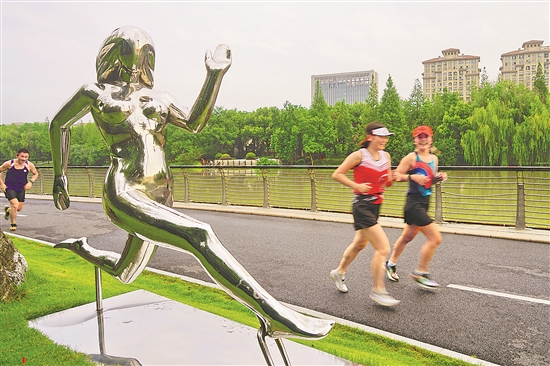 8月8日,市民在浙江省嘉兴市南湖区凌公塘文化主题公园晨跑。