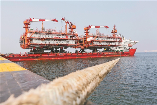 这是8月9日在天津滨海新区拍摄的渤中19-6凝析气田I期开发项目组块装船作业现场。组块装船后将赴渤海西部海域,进入海上安装和联调阶段。