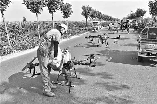 近日,山东省成武县的粮食种植户利用有利气象条件开展农用植保无人机飞防作业,为秋粮丰收提供有力保障。成武县今年秋粮种植面积约71万亩,其中约50万亩使用了农用植保无人机进行飞防作业。新华社记者 徐速绘 摄