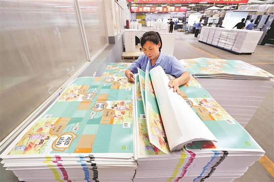 8月11日,在位于石家庄的河北新华第二印刷有限责任公司,工人对教材印刷品进行检查。连日来,河北省中小学部分教材的印刷等工作有序开展。新华社发(梁子栋 摄)