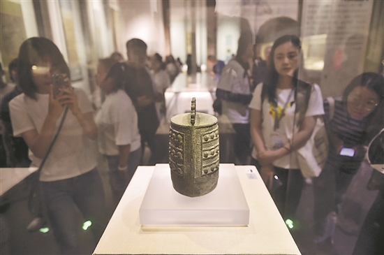 8月9日,观众在河南省开封市博物馆里参观“大晟夷则”铜编钟。