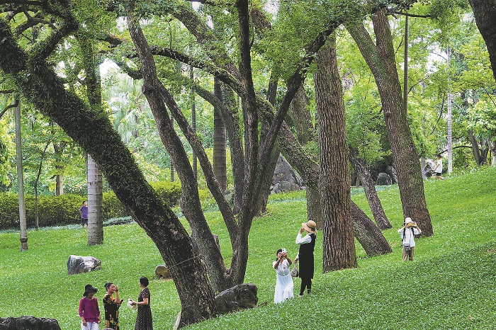 8月9日,市民在广西南宁市人民公园望仙坡的古樟树林游玩拍照。这里古树参天、林木葱茏,有“都市森林”的美誉,吸引了很多市民在林间休闲游玩,享受夏日清凉。