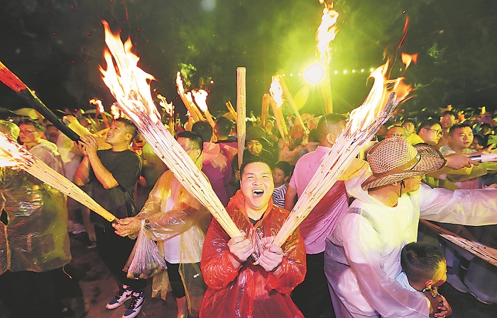云南民族村游客在大雨中参加火把节庆祝活动。杨峥 摄/视觉中国