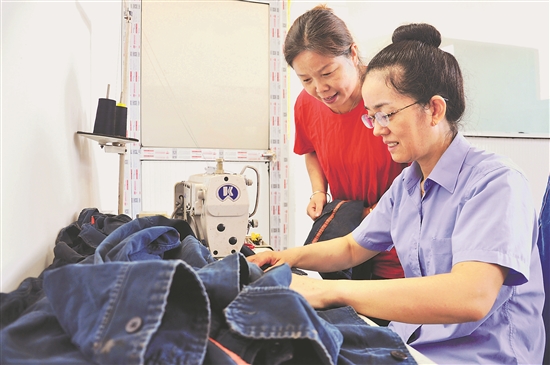 8月10日,安徽淮北矿业集团朱仙庄矿洗衣班班长王祥云(右)向刚调入班组的女工翟晓明传授缝纫机使用技巧。