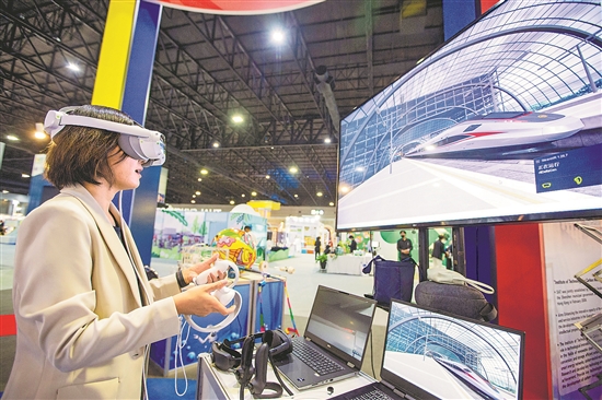 图为在泰国曼谷举办的泰国国家科学技术展上,一名女子在中国馆体验虚拟交互系统。新华社记者 王腾 摄
