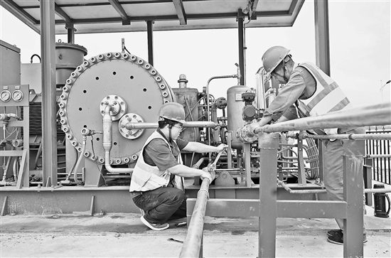 8月10日,工人在中国能建张掖氢能综合应用示范项目调试氢气加压装置。