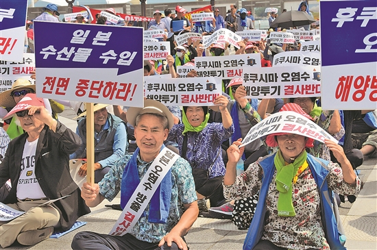 当地时间8月16日,在韩国全罗南道高兴郡沿海一带,韩国渔民手持标语参加集会活动,抗议日本核污染水排海计划。新华社记者 周思雨 摄