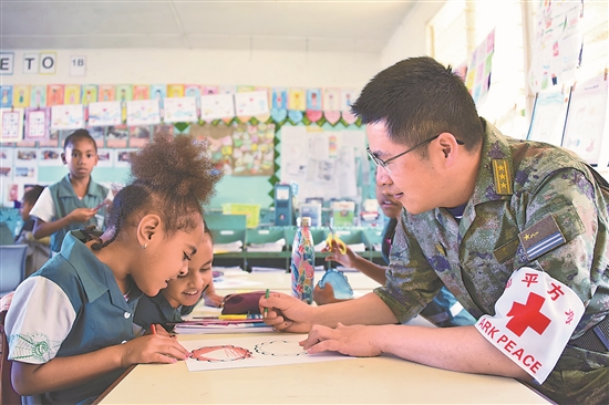 中国海军“和平方舟”号人员在瓦努阿图一所学校同学生一起画画。新华社记者 黎云 摄
