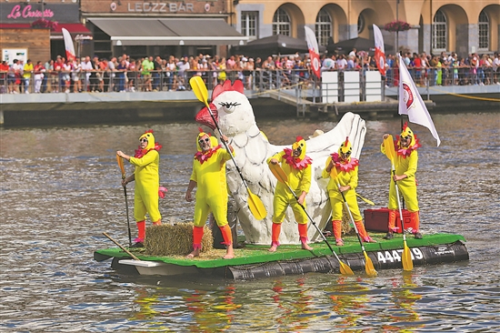 当地时间8月15日,在比利时南部小城迪南的默兹河上,人们参加“浴缸划船节”。该活动始于1982年,已成为比利时热闹的夏季节庆活动之一。今年的“浴缸划船节”主题为“默兹河上的农场”,参加者围绕浴缸打造稀奇古怪的船只,比拼设计创意及现场表演。 新华社记者 郑焕松 摄