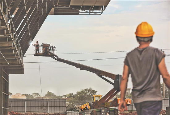8月14日,在江西省瑞金市瑞金机场建设工地,工人们正在为机场早日通航加紧施工。