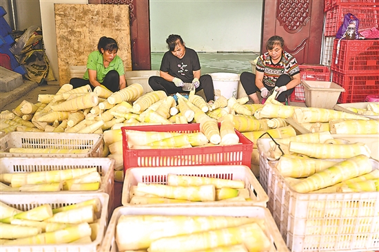 目前正值广西柳州市柳城县竹笋收获的季节,柳城县沙埔镇种植的近万亩竹林喜获丰收,当地农民忙着挖笋、剥笋、腌制酸笋,随处可见忙碌的场景。近年来,柳城县积极打造柳州螺蛳粉原材料生产基地,大力发展竹笋种植和深加工产业,带动农户增收致富,助力乡村振兴。新华社发(黎寒池 摄)