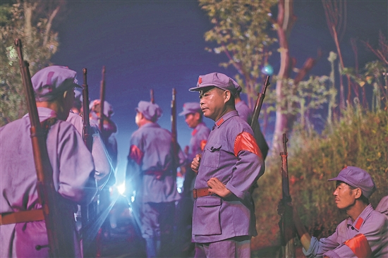 8月14日晚,江西省瑞金市沙洲坝镇洁源村,《浴血瑞京》红色实景演艺正在上演。
