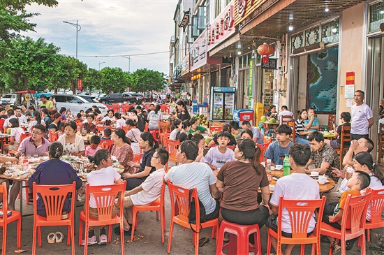 南海开渔后,海南琼海潭门镇千年渔港海鲜大排档随之火爆起来。各海鲜坊食客如云,人们品尝海鲜美食,分享渔民收获的快乐。蒙钟德 摄/中新社