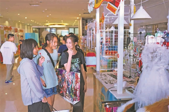 8月22日,在位于湖州市吴兴区爱山街道的银泰城,人们在一个市集参观。