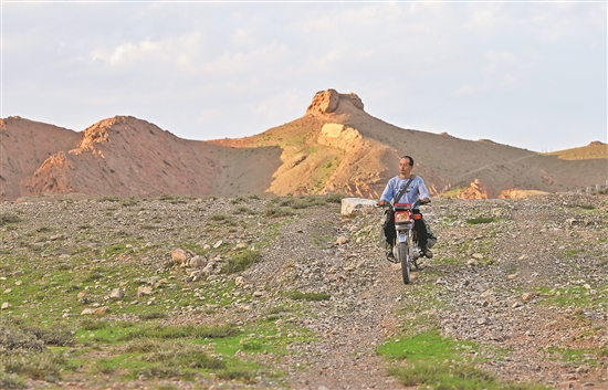 董海宁巡护的长城,属于阿拉善左旗巴润别立镇与宁夏永宁县交界的明长城磨石口段。一辆摩托车、一台望远镜就是他最得力的“助手”。几年来,董海宁或骑行或徒步,定期巡查管辖范围的长城,清除墙体的杂草和垃圾,向游客宣介长城保护知识等。