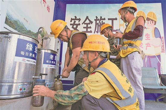 近日,为应对重庆的持续高温天气,中铁二十二局集团第五工程有限公司采取错时施工、发放防暑降温物资、工地喷淋降温等措施,关爱一线建筑工人身体健康。图为项目工人在饮用解暑饮品。本报通讯员 唐海洋 摄