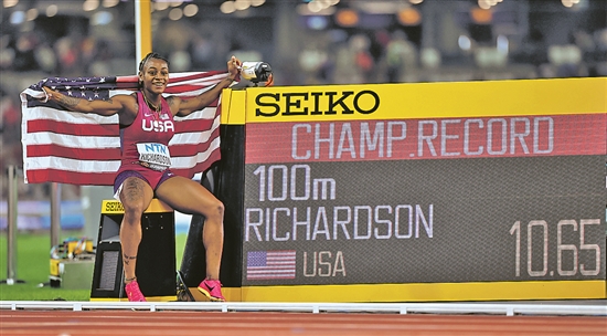 当日,在匈牙利布达佩斯举行的2023世界田径锦标赛女子100米决赛中,美国选手理查德森以10秒65的成绩夺得冠军并打破世锦赛赛会纪录。新华社记者 王丽莉 摄