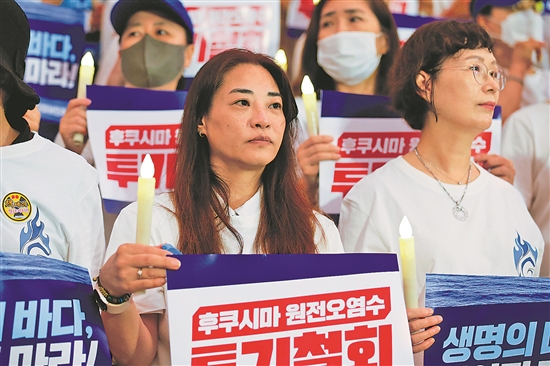 参加集会的市民手中高举“誓死反对(核污染水)排海”“大海不是日本的核垃圾场”“谴责杀死海洋的日本政府”等标语,面向日本驻韩国大使馆齐声高呼“(韩国)国民愤怒不安,立即撤回核污染水排海决定”等口号。