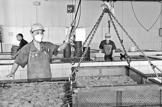 8月22日,在山东省滨州市沾化区冯家镇隆旺水产的加工车间内,工人正在给海蜇更换浸泡用水,保证咸度适中。