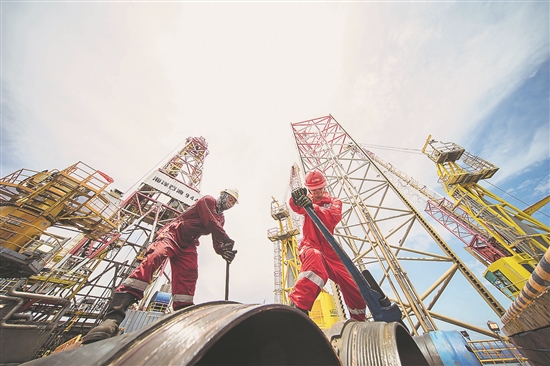 8月20日,在中国南海东方气田高温高压探井作业现场,平台甲板工赵开固(图左)和唐才世头顶烈日进行20寸套管铺排工作。本报通讯员 王振宇 摄