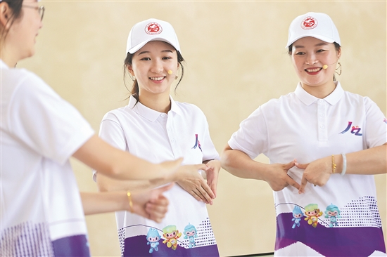 8月23日,在浙江工业大学莫干山校区,杭州亚运会湖州赛区志愿者在培训老师的讲解下学习手语、应急处置等知识,为服务亚运会做准备。本报通讯员 谢尚国 摄