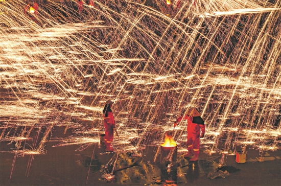 8月16日,内蒙古鄂尔多斯文化产业园景区举办“华夏铁魂”主题活动,邀请民间艺人表演“铁花秀”。本报通讯员 王正 摄