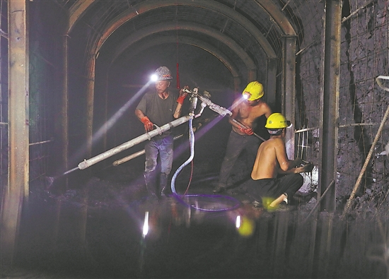 8月24日,湖南省新田县毛俊水库七贤山隧道建设工地,工人在施工作业。毛俊水库工程是全国重大水利工程项目之一,灌区涉及3个县,灌溉农田41.15万亩。本报通讯员 刘贵雄 摄