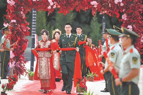 8月22日,在福建平潭坛南湾远垱澳海滩,新人们步入婚礼现场。当日,福建海警局举行集体婚礼,23名海警执法员与新娘喜结连理。本报通讯员 谢贵明 摄