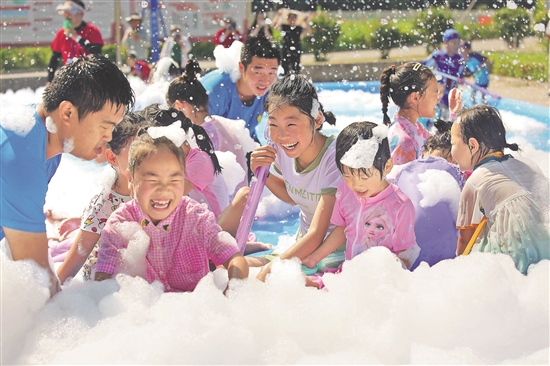 8月24日,在江苏省连云港市连云区连岛街道大路口社区,孩子们在“水上游戏”活动中进行水枪大战、泡泡秀、水上游戏等活动,在家门口感受“亲水”的快乐。本报通讯员 朱华南 摄
