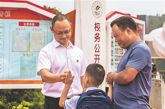 8月21日,贵州省黔西市惠风学校老师向新生击掌鼓励。当日,贵州省各地中小学迎来开学日。本报通讯员 范晖 摄