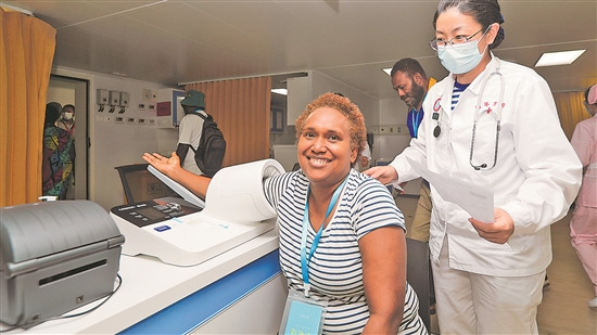 访问所罗门群岛期间,前来就诊的所罗门民众在中国海军“和平方舟”号医院船进行血压检测。新华社发 (黎宇 摄)