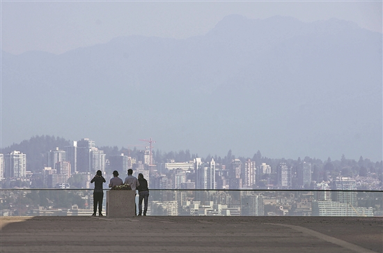 这是当地时间8月26日拍摄的被烟雾笼罩的加拿大温哥华。受野火产生的烟雾影响,位于加拿大西部大不列颠哥伦比亚省的温哥华市空气堪忧。新华社发 (梁森 摄)