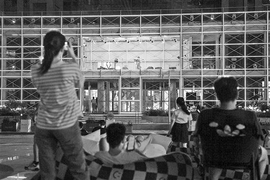 市民游客在南京市建邺区西城·夜未央街区内观看空中舞台表演(8月25日摄)。