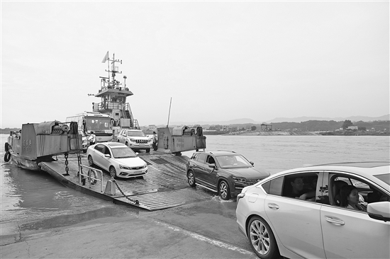 8月28日,车辆在泥溪北渡口下渡船。