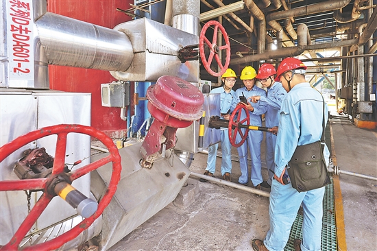 图为芳烃厂二甲苯装置人员分析5G智能巡检系统巡检参数。李树鹏/摄 鲁荟宇/文
