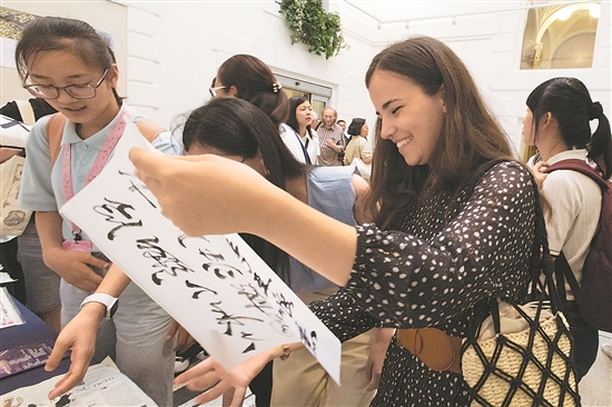 当地时间8月29日,嘉宾在匈牙利布达佩斯体验中国书法。 新华社发(弗尔季·奥蒂洛 摄)