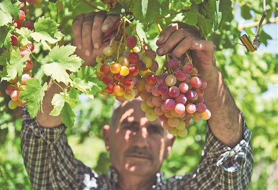 当地时间8月29日,在叙利亚大马士革,农民收获葡萄。新华社发(阿马尔·萨法尔贾拉尼 摄)