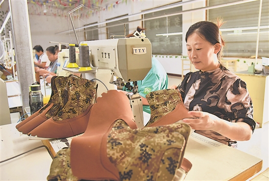 8月29日,工人在河北省威县香花营村一家制鞋厂生产车间工作。
