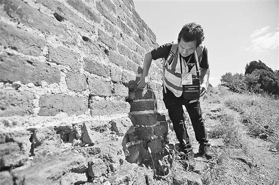 8月29日,俞海文在长城上检查长城墙体。