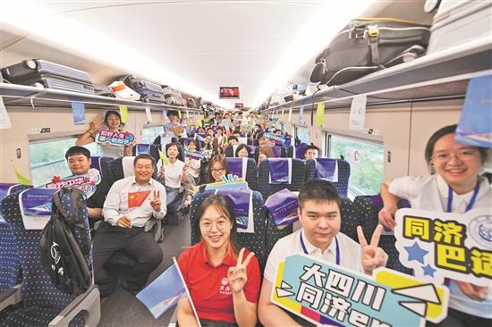 当日,四川省同济大学校友会和同济大学四川招生组联合中国铁路成都局集团有限公司,举行高铁“包车”活动,免费送同济大学150名2023级四川籍新生和他们的家长前往上海。