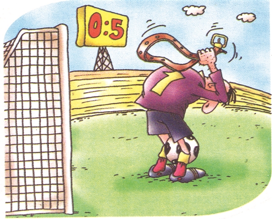绿茵场上门将连连失手,被对方“灌”进数球,气急之下狠狠“教训”不争气的皮球。此举不但没有赢回面子,还输掉球队的“牌子”。