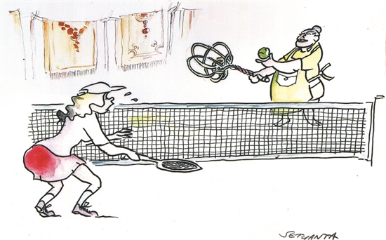 女孩在网前久等不到球友赴约,邻居大妈抄起掸尘的藤拍当起“替补”,且不说技艺如何,关键时刻成人之美值得点赞。