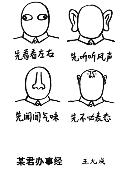 而从立意上看,这样的处理,是为作者表达自己观点服务的。漫画家王九成先生的《某君办事经》,或许可以当作这类漫画语言的范本。